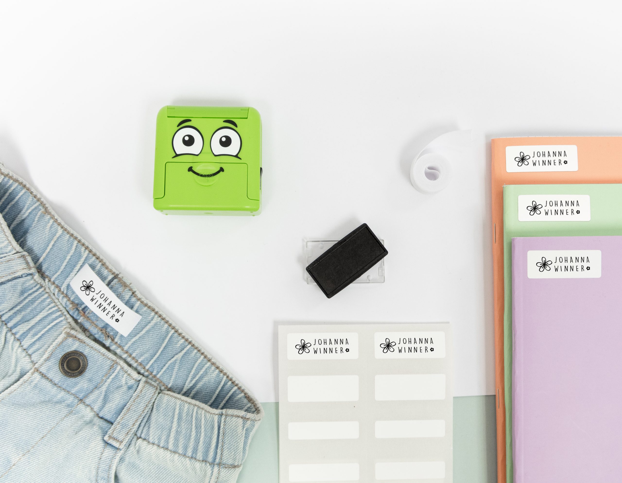 El kit incluye: 1 m de cinta blanca termoadhesiva, 40 etiquetas (24 etiquetas de 10 x 40 mm + 16 etiquetas de 15 x 40 mm) y 1 cartucho de tinta textil dermatológicamente testada (no tóxica) con 1000 impresiones disponibles.