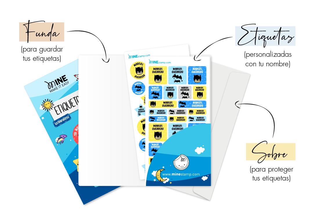 Si te gustó nuestra colección de sellos, ¡Nuestro fantástico pack de etiquetas textiles termoadhesivas y adhesivas Espacio personalizadas te encantará! Podrás marcar objetos, ropa, mochilas, estuches, libretas, lápices, papel, tuppers y todo lo que imagines, ya que se adhieren de forma permanente sobre tejidos, plástico, madera, metal, caucho, papel, cerámica y vidrio. No se rompen y no se desgastan con el roce, resistiendo incluso al microondas y al agua. Puedes ver nuestras colecciones de etiquetas aquí. Elige la que más te guste, personalízalas con tu nombre, ¡Y a pegar!